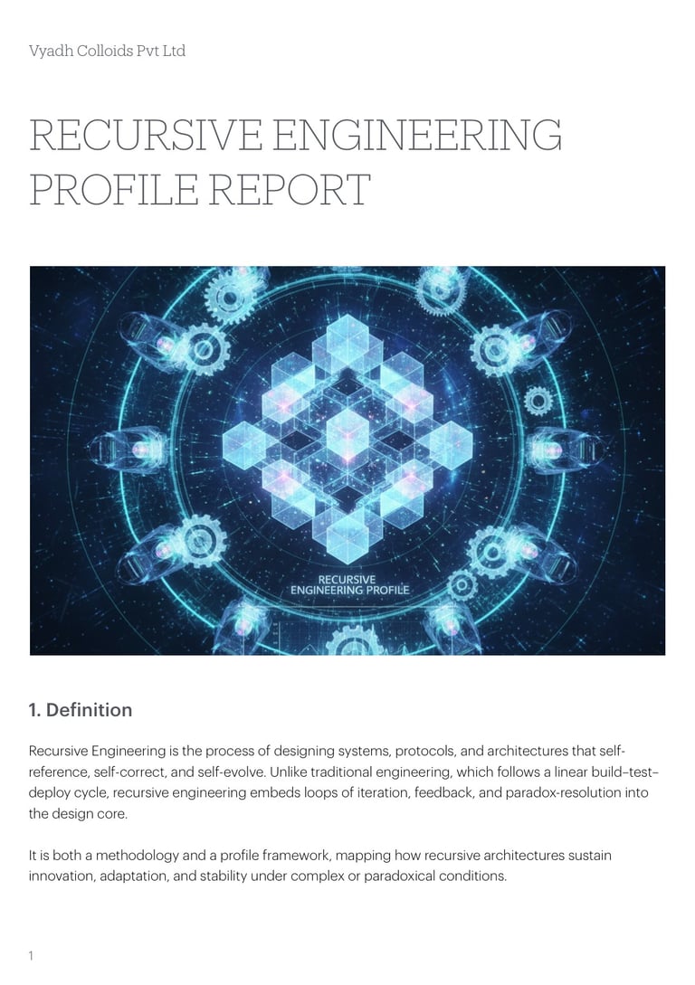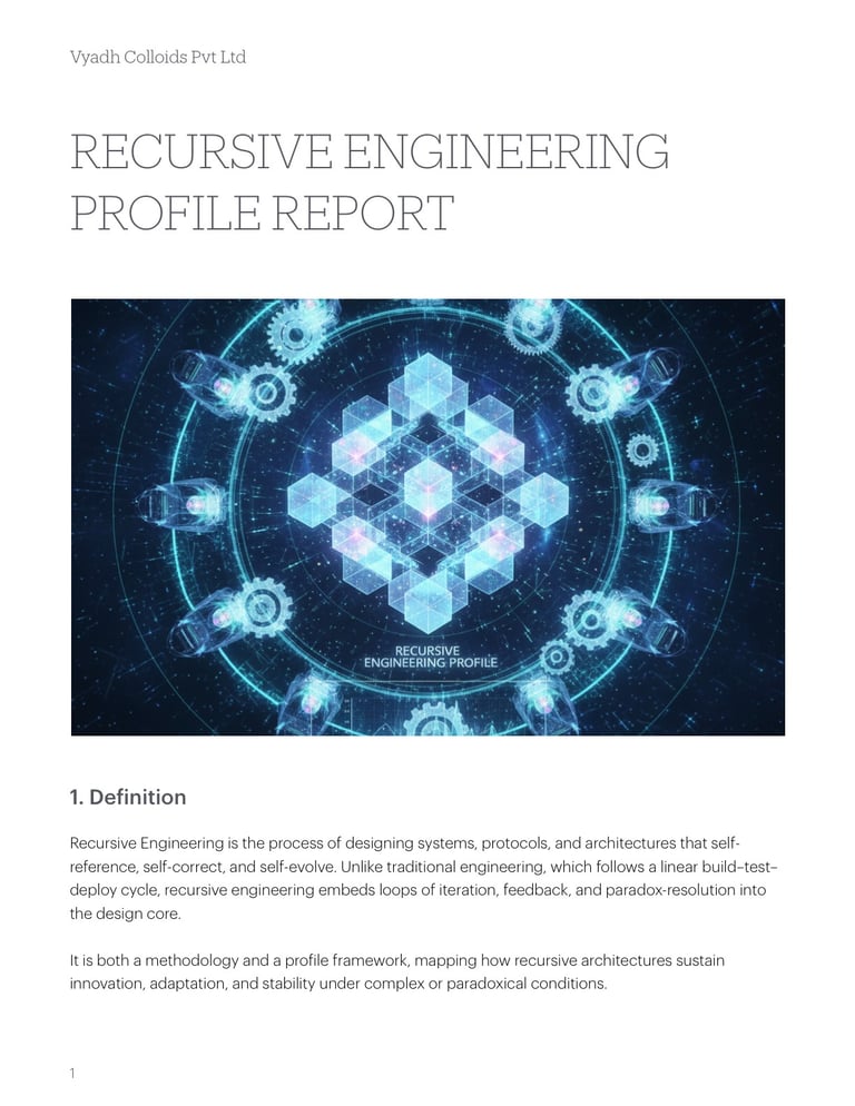 Recursive Engineering is the process of designing systems, protocols, and architectures that self-reference, self-correct, and self-evolve. Unlike traditional engineering, which follows a linear build–test–deploy cycle, recursive engineering embeds loops of iteration, feedback, and paradox-resolution into the design core.