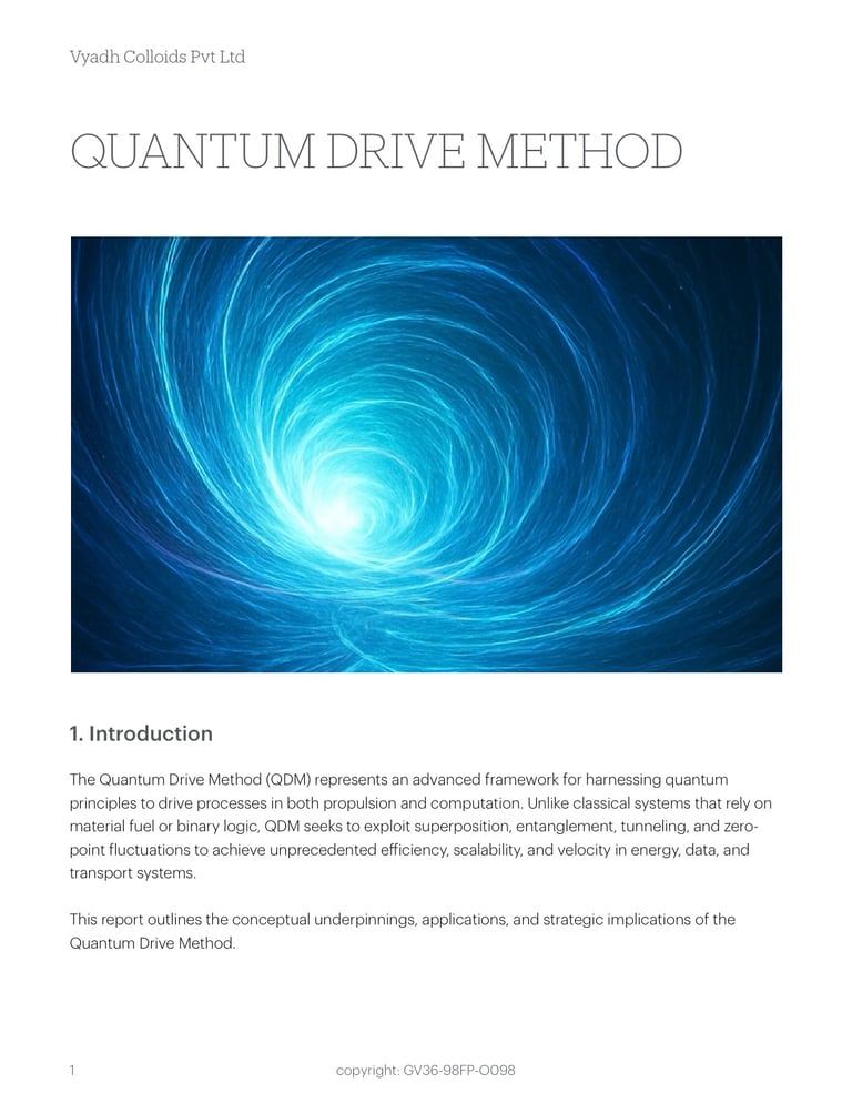The Quantum Drive Method (QDM) represents an advanced framework for harnessing quantumprinciples to drive processes in both propulsion and computation. Unlike classical systems that rely onmaterial fuel or binary logic, QDM seeks to exploit superposition, entanglement, tunneling, and zeropointfluctuations to achieve unprecedented efficiency, scalability, and velocity in energy, data, and transport systems.